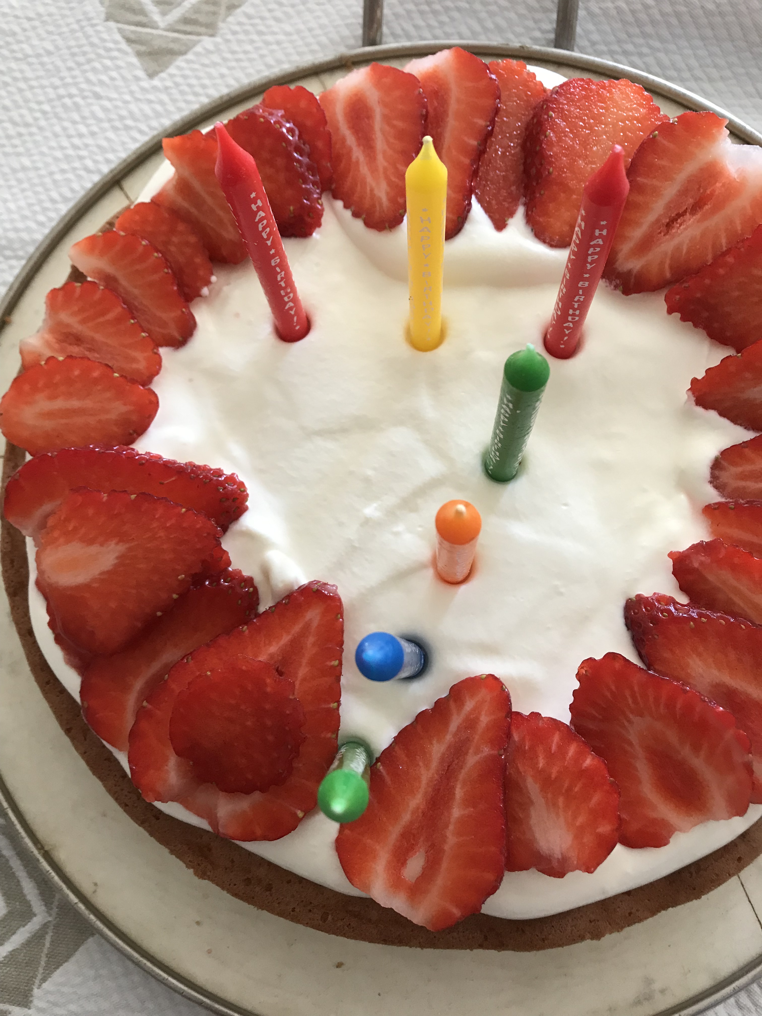 More than eleven years ago now, when our eldest daughter turned 3, she asked for a special birthday cake… She was born in August, a season where fruit is ripe and juicy and plentiful. She said: “Mummy, for my birthday, I want a cake with lots of strawberries and cream!”