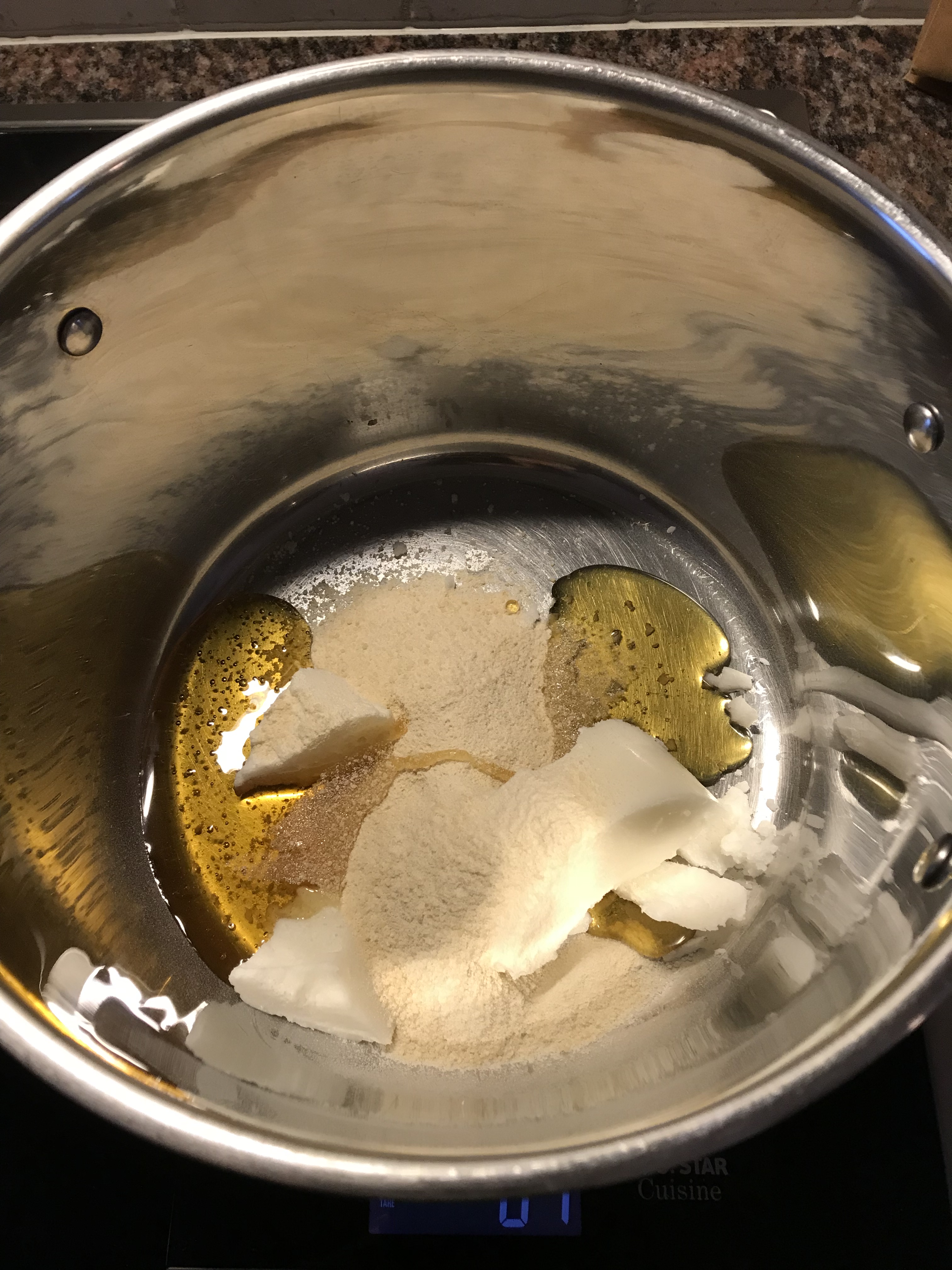- Place the coconut oil, sugar and honey in a large saucepan. Heat gently and mix until everything is dissolved.