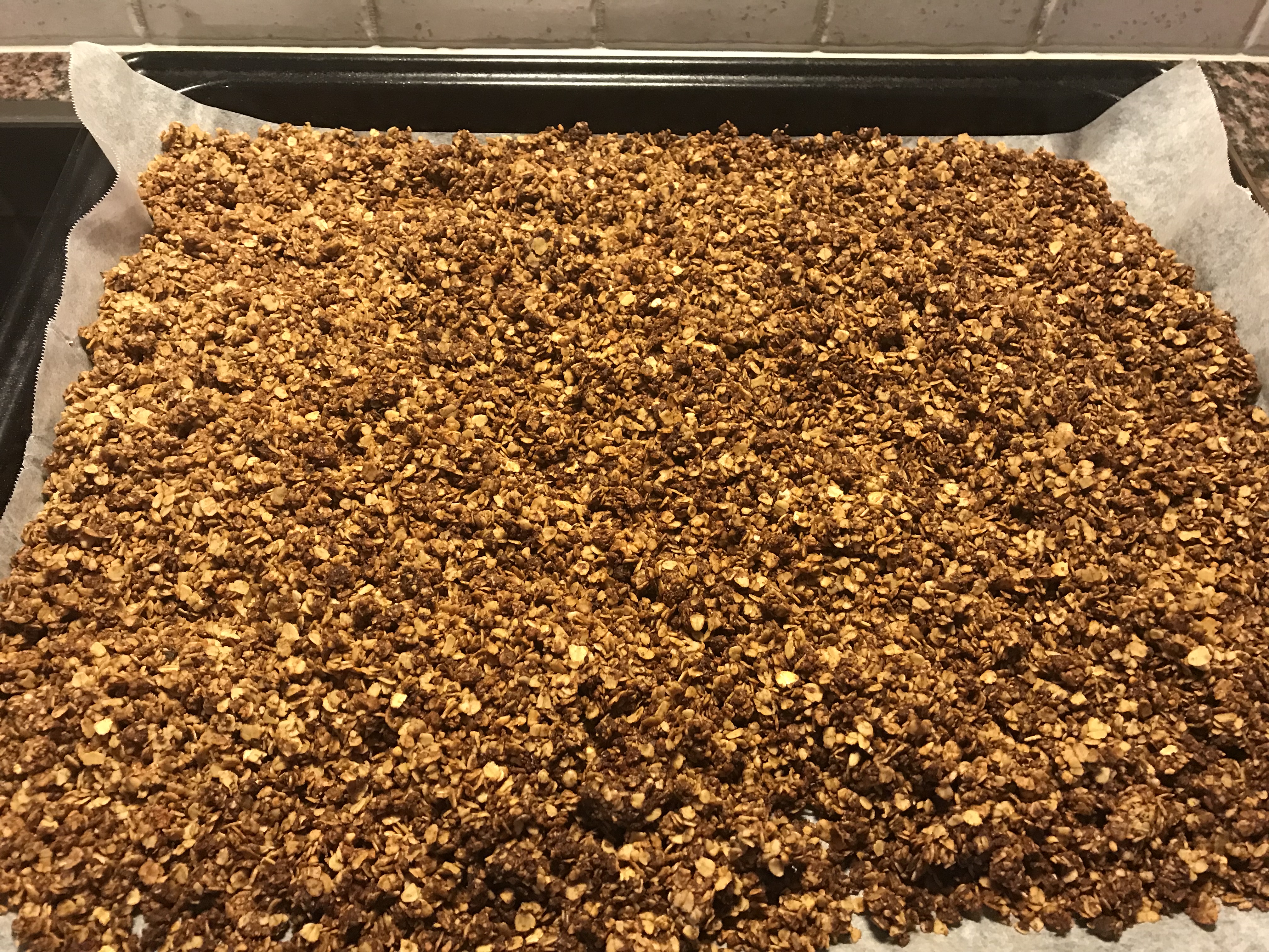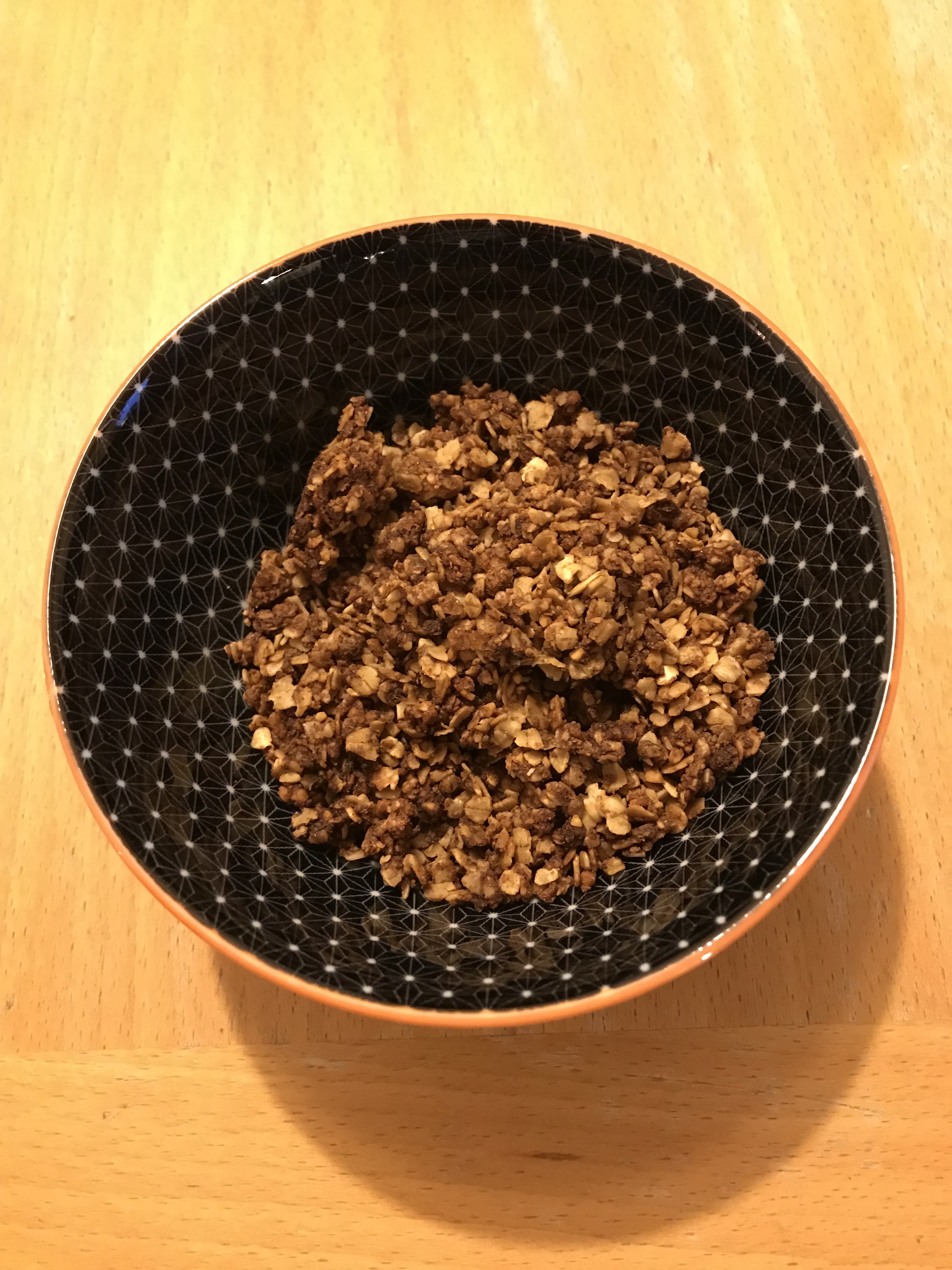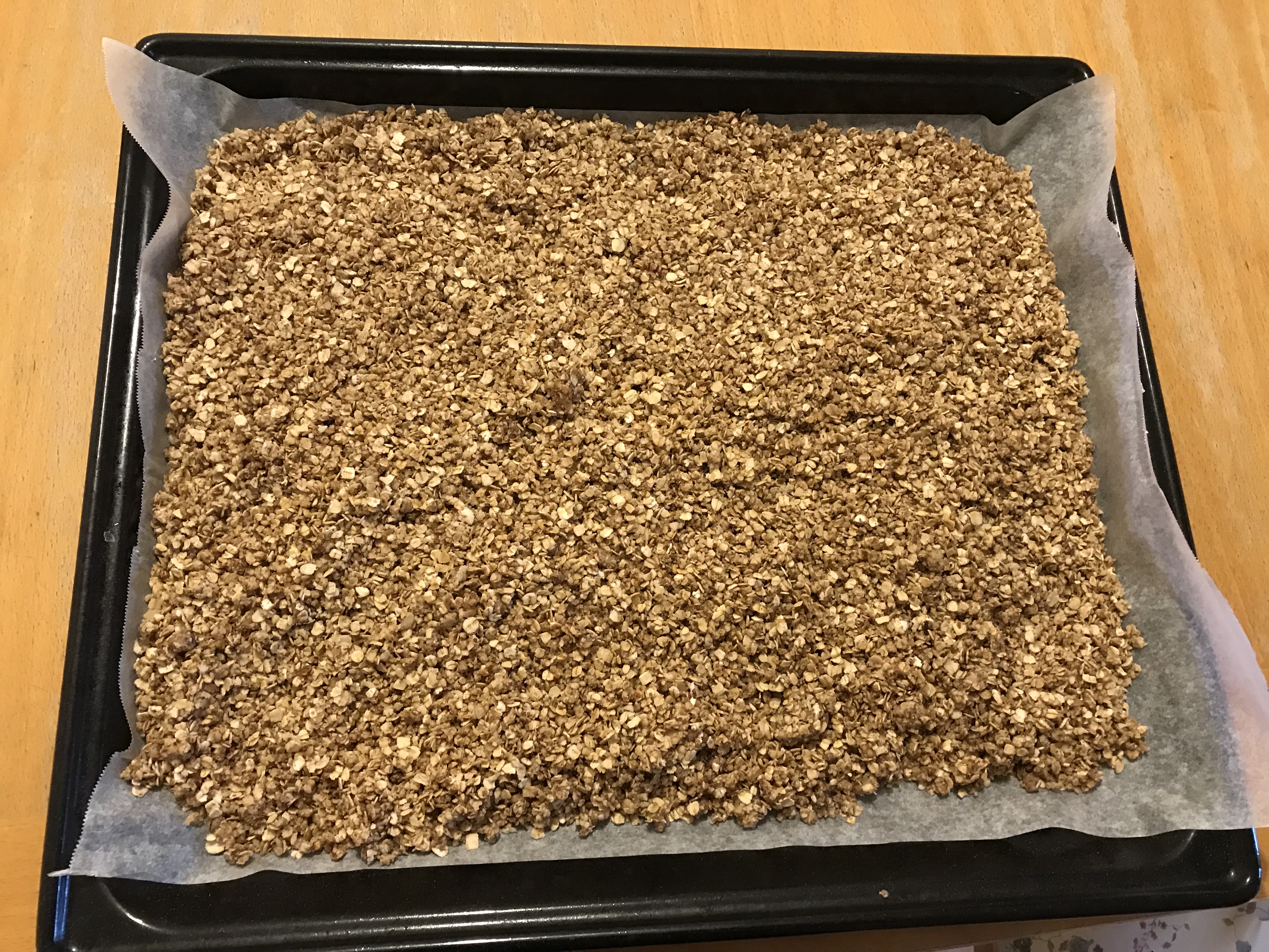 - Keep an eye on the granola during the last 10 minutes of baking. It must be cooked enough but it really mustn’t burn. Depending on how your oven behaves, you might have to take out the tray, mix the granola a little and bake it a little longer.