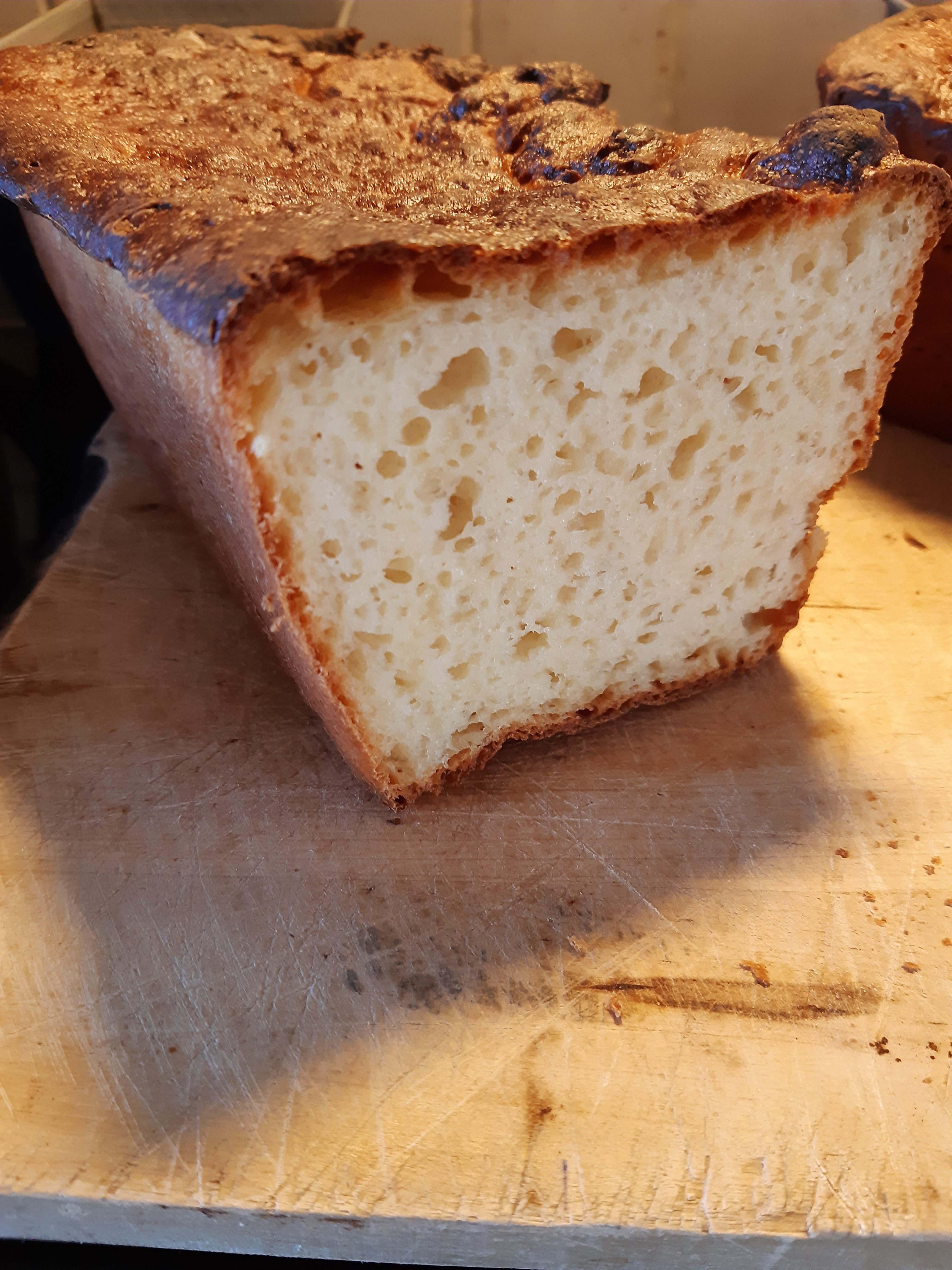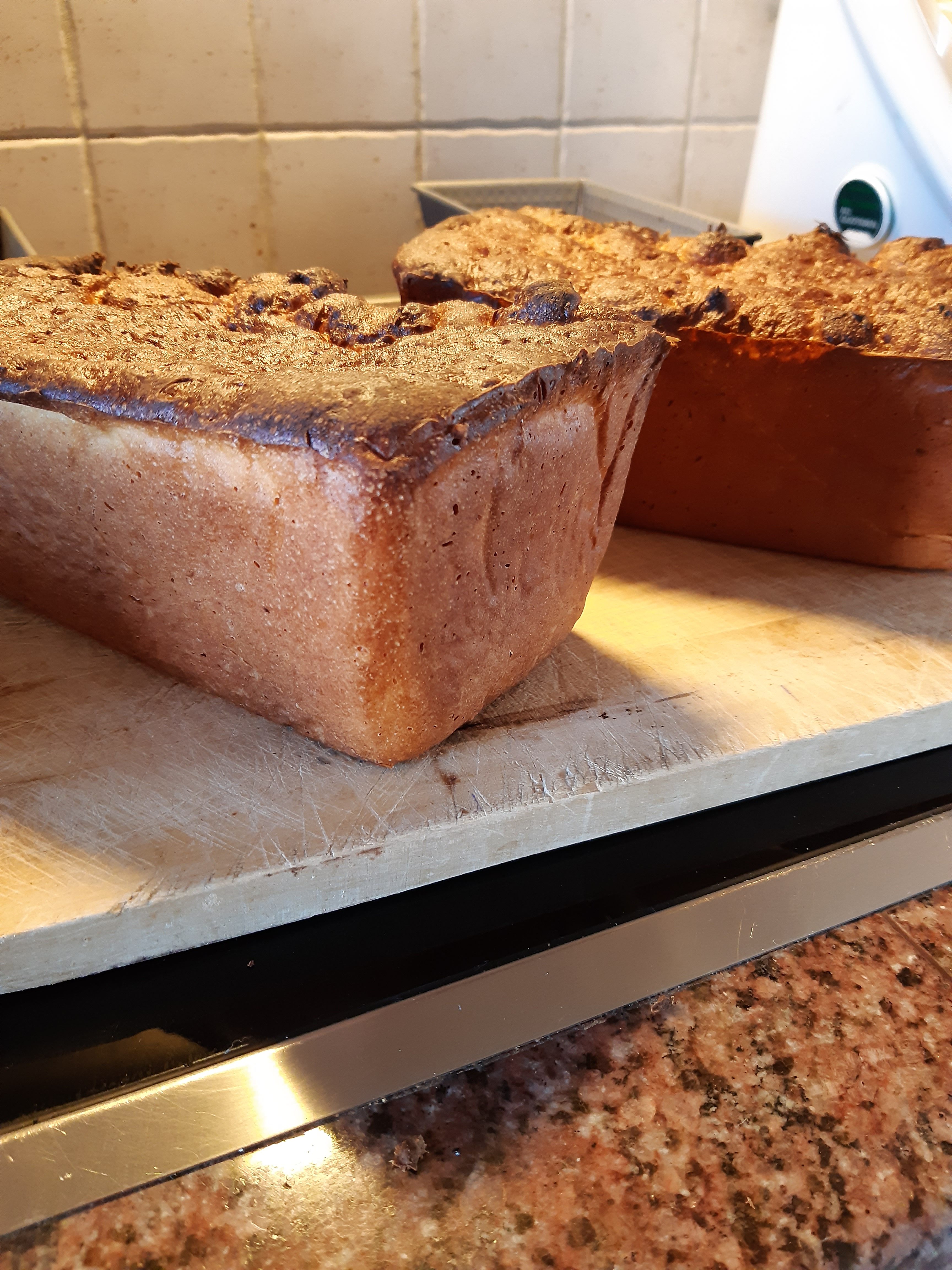 As usual, you can make two loaves and freeze one of them, it works fine – just take the frozen loaf out and let it thaw overnight, then put it in the oven for roughly ten minutes, just to make it nice and crisp on the outside again.