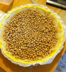- Line it with another sheet of baking paper and fill it with dried baking beans or chickpeas, just like this: