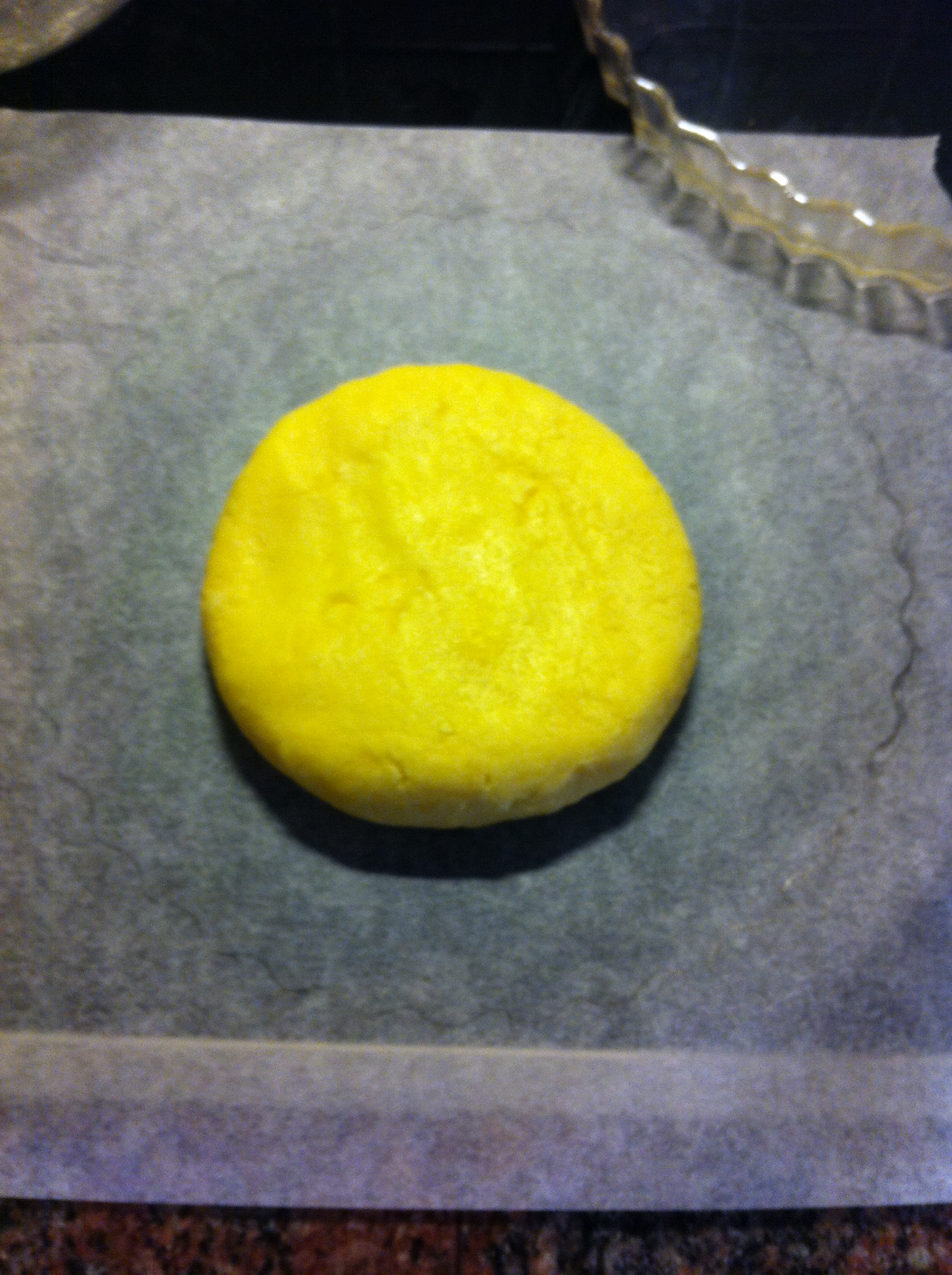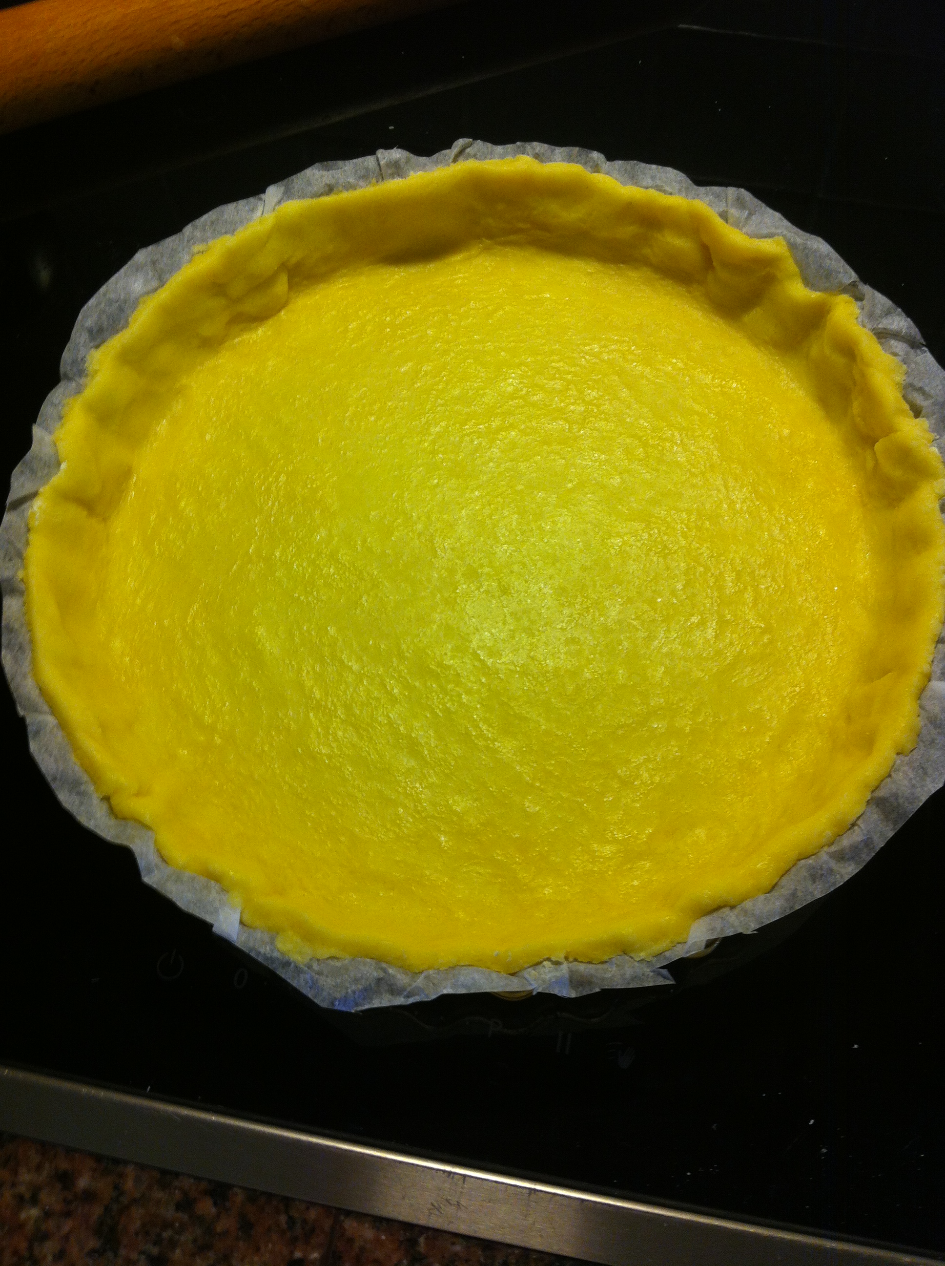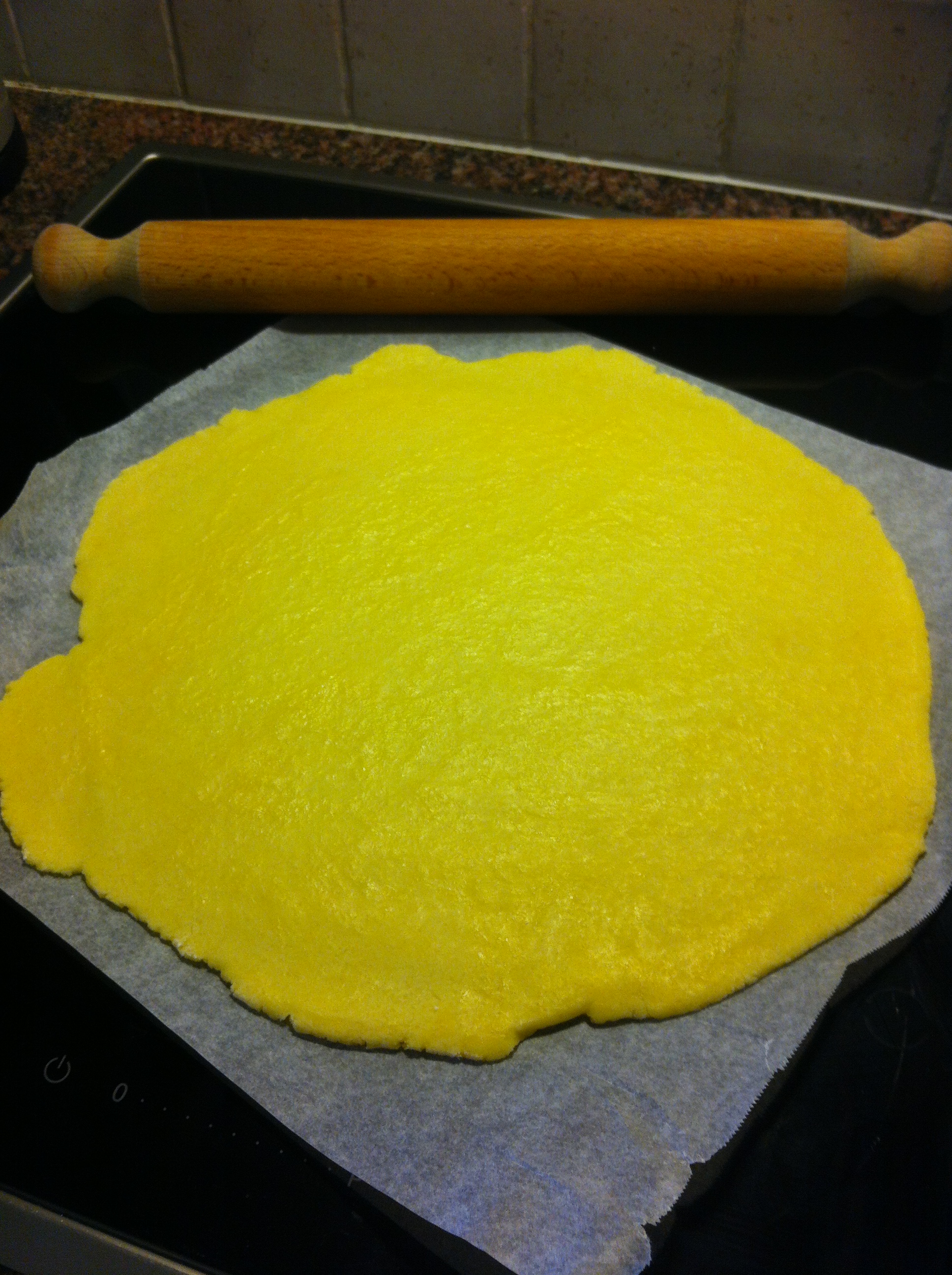 - Lightly flour the baking paper and roll the pastry dough in a circle.