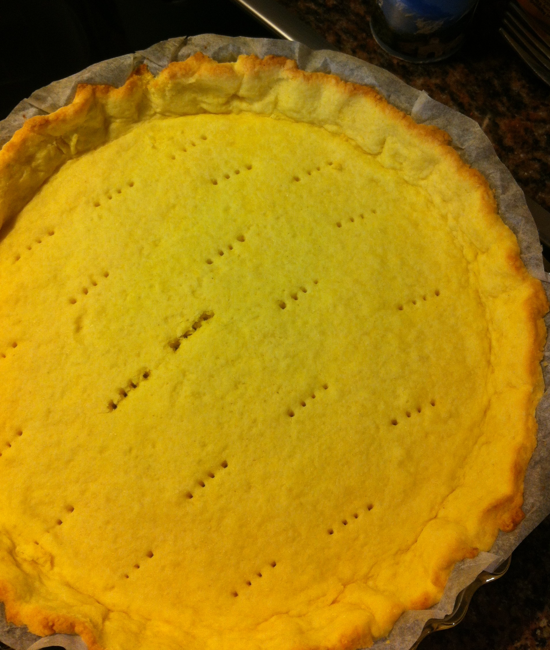 - Take the pastry out of the fridge and prick it lightly with a fork.
