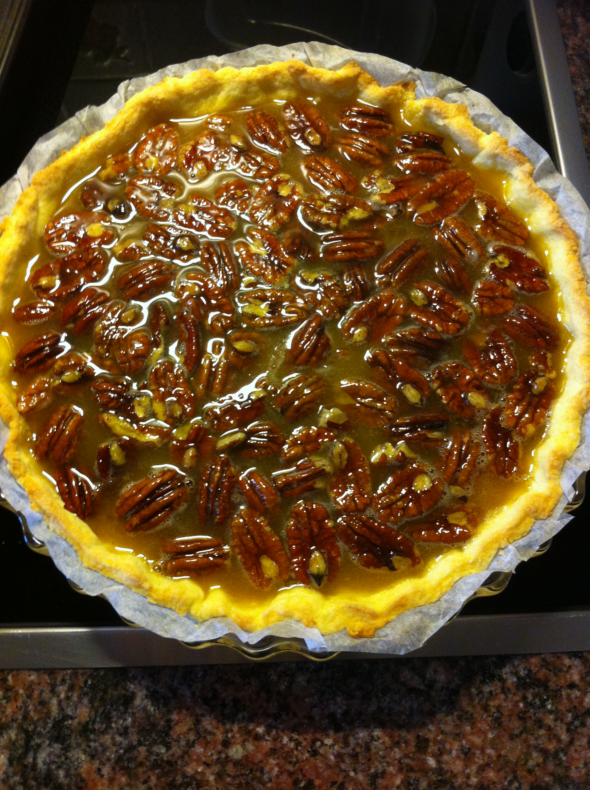 Last night, we were invited by some of our very good American friends for a Thanksgiving dinner. Our host said that for dessert, there would be pecan pie and pumpkin pie… and I thought it would be really, really tough to have to watch everyone eat those mouth-watering pies and not be able to have a bite! So I said I’d try and make a gluten-free version of pecan pie.