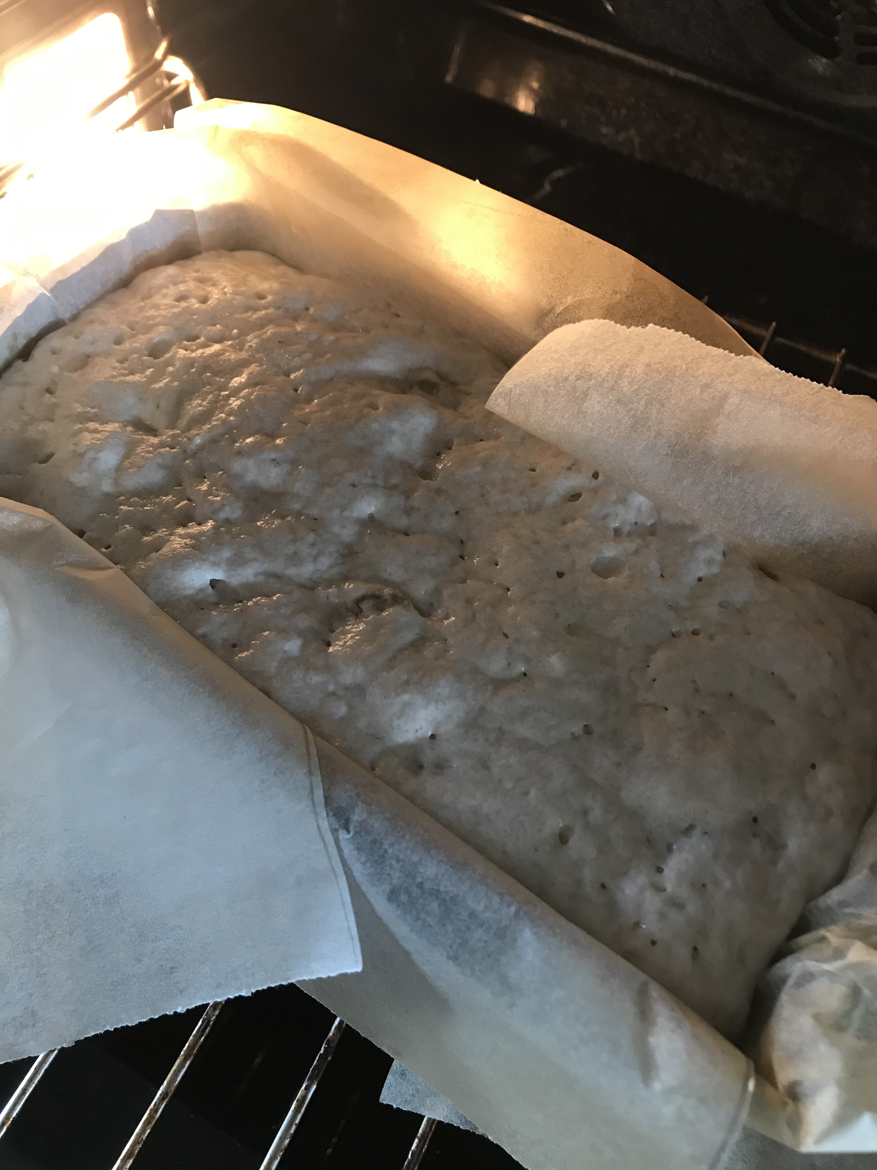 - Line the cake tin with some non-stick baking paper and pour the bread dough into it. Let the dough rise – if possible in a warm and humid place. It should take between 30 minutes and an hour to rise.