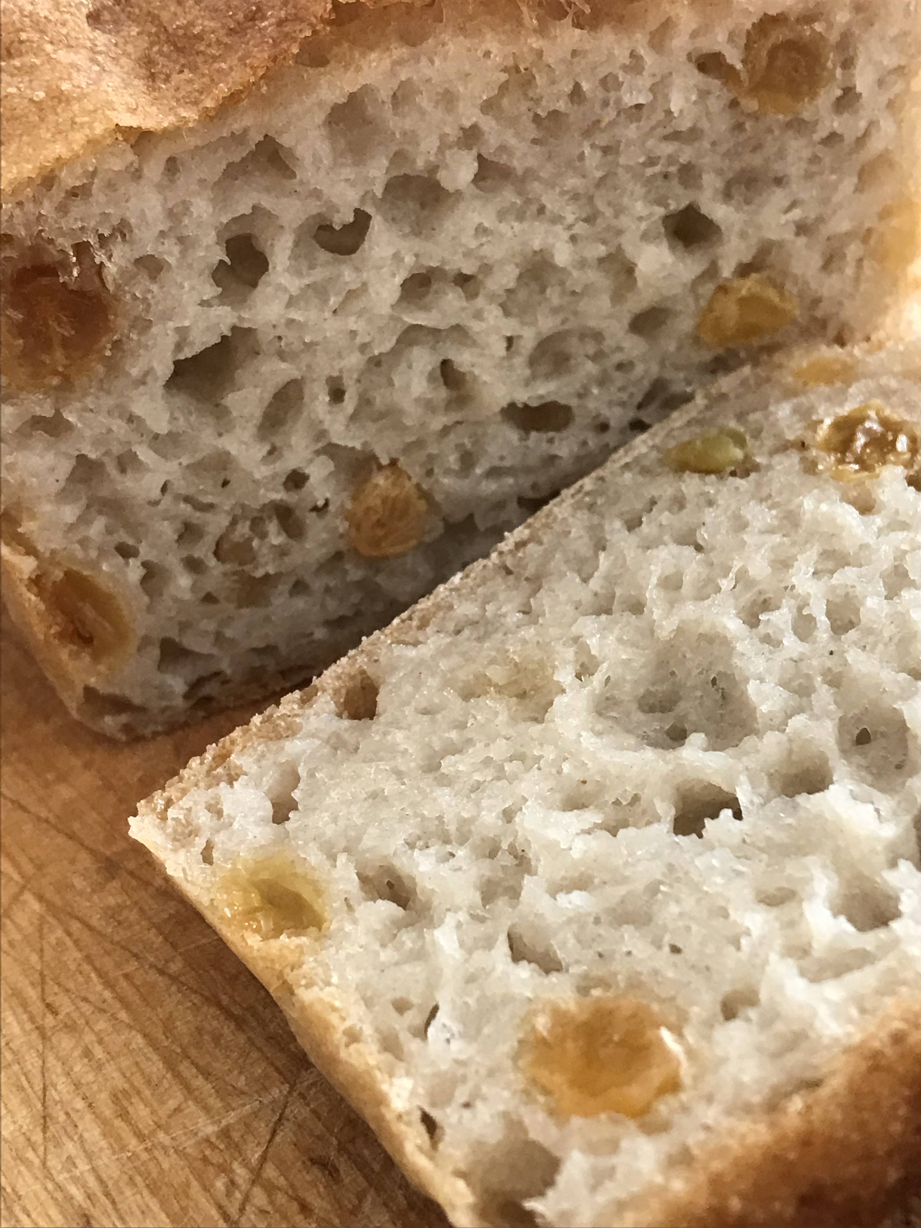 My inspiration for this bread came from a recipe in the book I was talking about on my teff bread page. This book, sadly only available in French, has a recipe for a loaf of fig and walnut bread. Like most of the recipes in the book, it looks delicious, but my problem is that I don’t really like dried figs and I’m not that keen on walnuts in my bread either… So I thought I would use the recipe as a base for a loaf of raisin bread. I used the same quantities of flour and water, but I made some changes in the kinds of flours used, I used raisins instead of figs, and I didn’t put any walnuts in.
