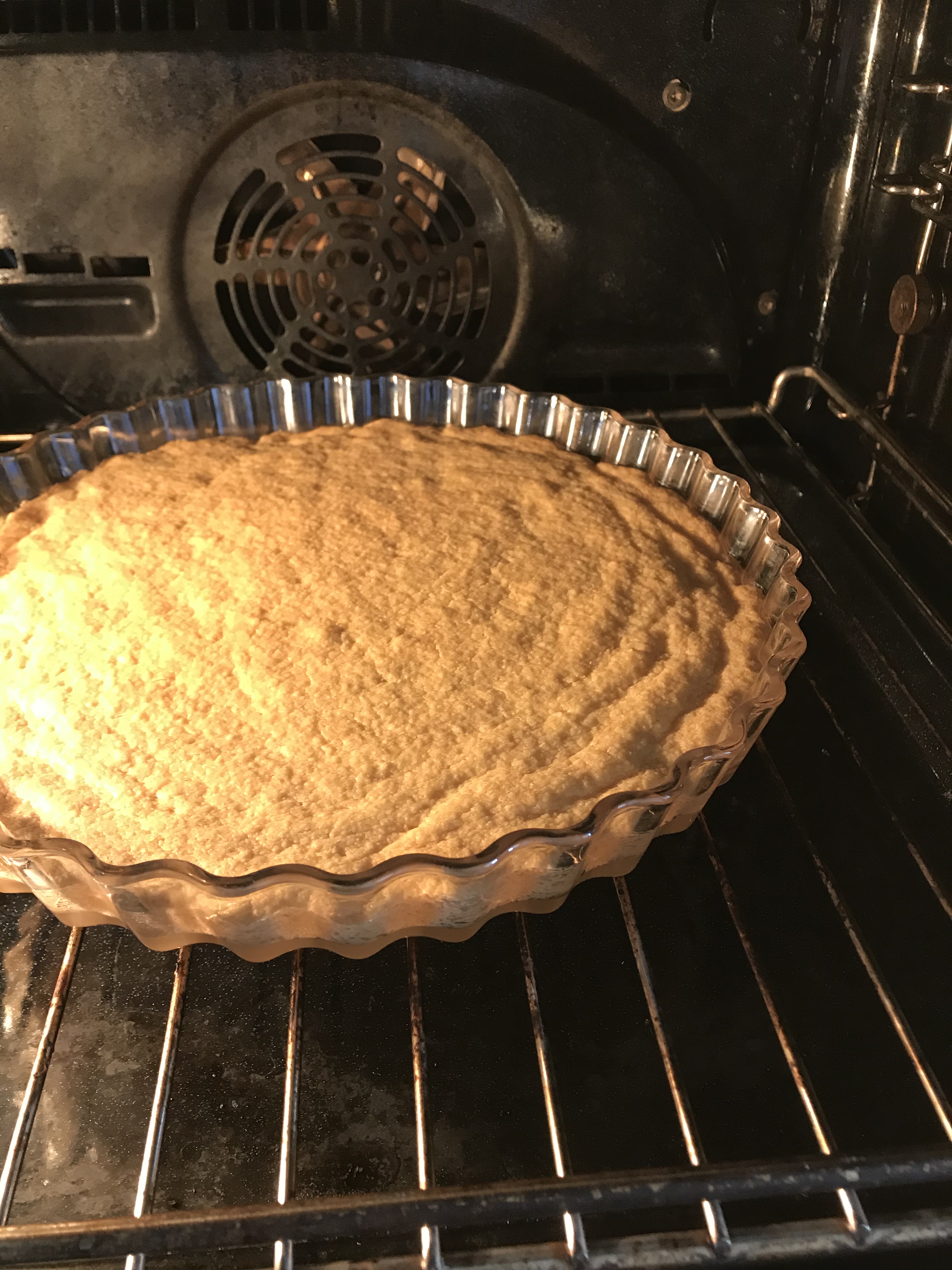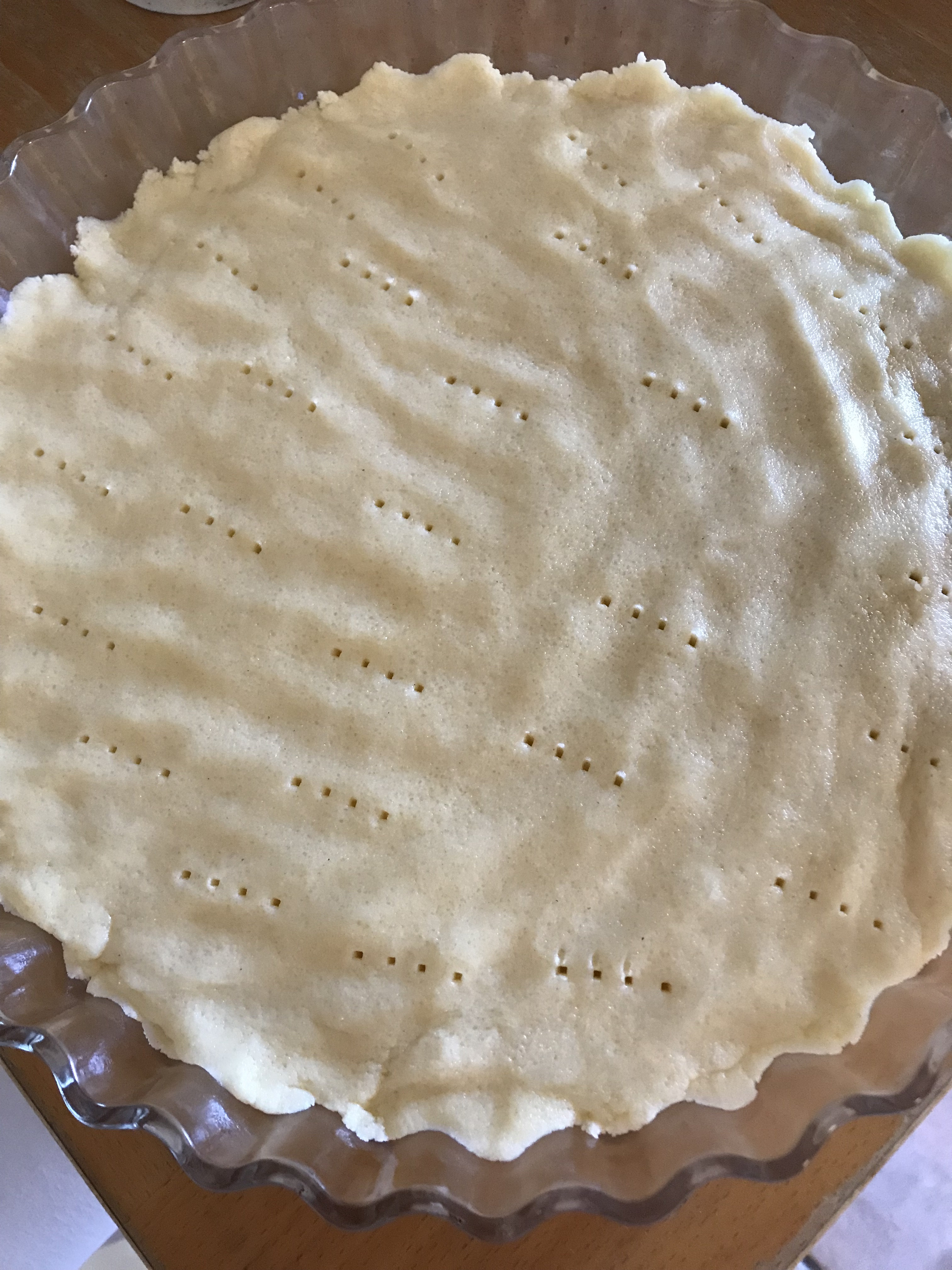 • Press the dough into an ovenproof dish – I used a round glass pie dish, with a diameter of 21 cm.  Prick the dough lightly with a fork.