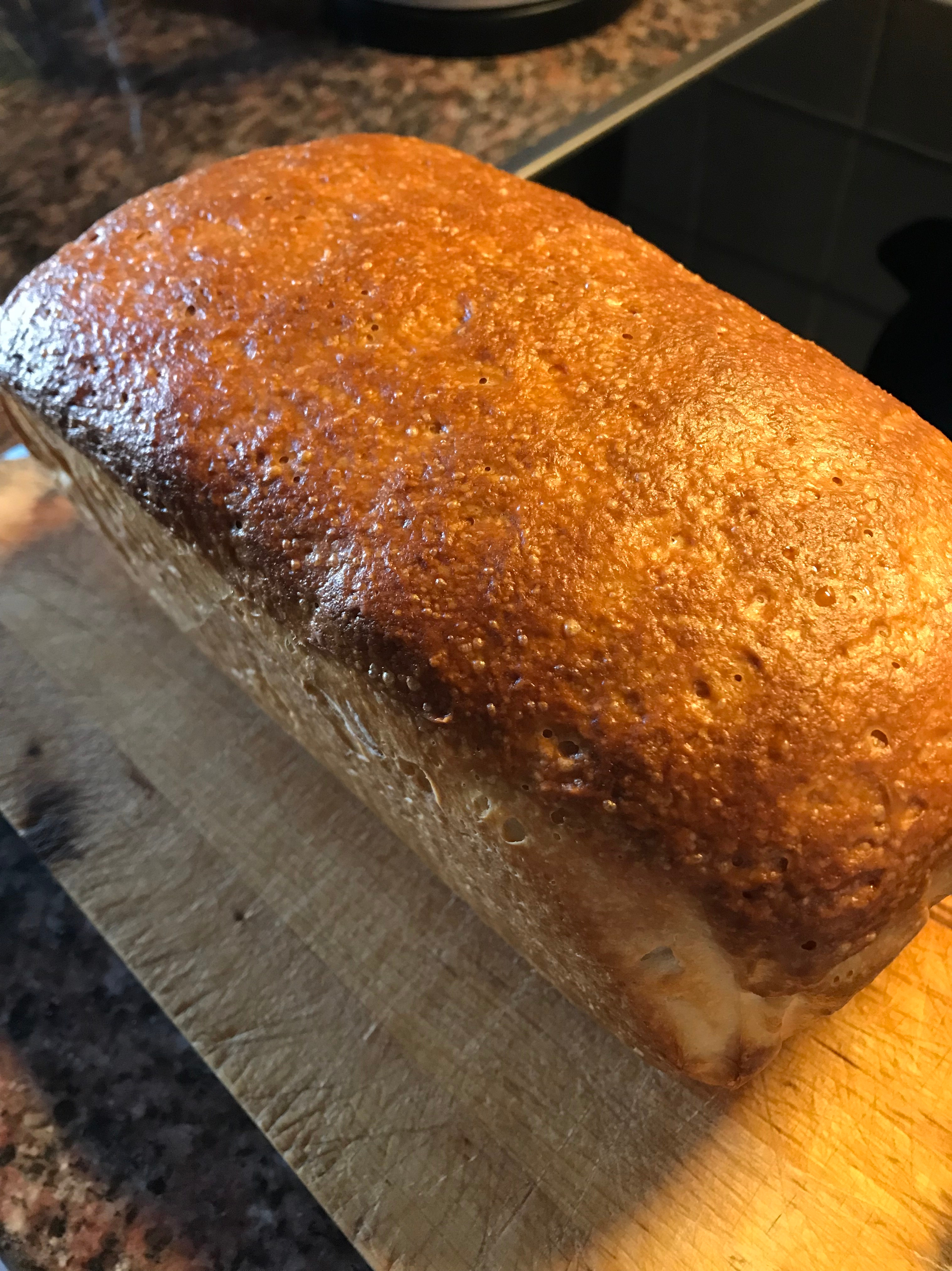 • Once the dough is risen, bake in the oven for 30-35 minutes at 200°C if you have a fan oven – 220°C if you use conventional heat.  I like my bread crisp on the outside, so I usually take the loaf out of the tin after 30 minutes, and bake it for a further 5 to 10 minutes, so the sides get nice, golden and crispy 🙂