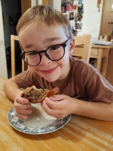 I had been given about 20 very ripe bananas and I needed to do something with them… so I came up with my own recipe of a gluten free banana and chocolate chip cake. We were all pleased with the result: it was moist and delicious! It didn’t last long… everyone wolfed it down!