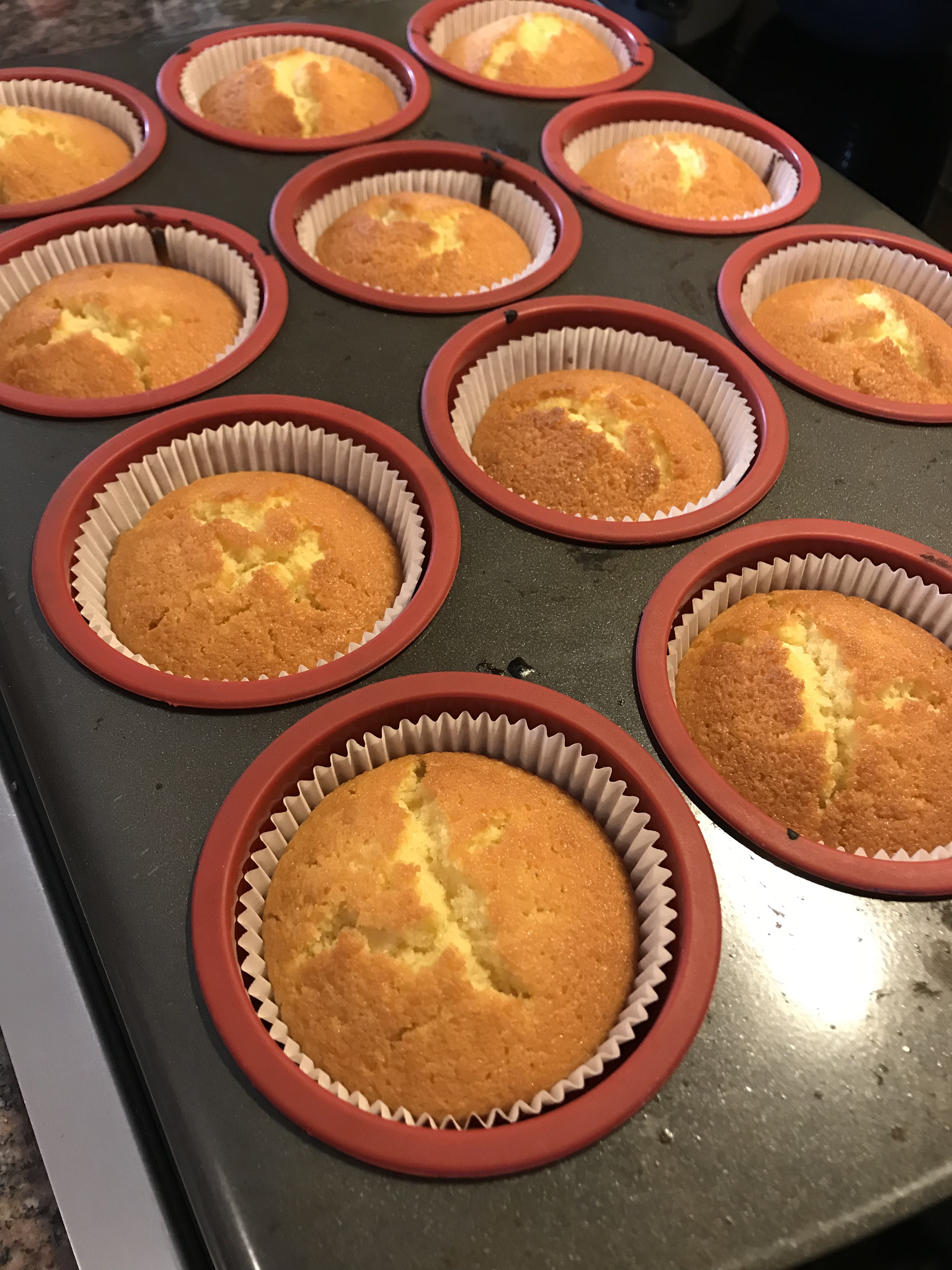 - For baking, I use a cupcake/muffin tray, with cupcake cases. Place a large spoonful of the mixture into each cupcake case and bake in the oven for 20 minutes, at 200°C. Don’t overcook the cupcakes, or they’ll be too dry.