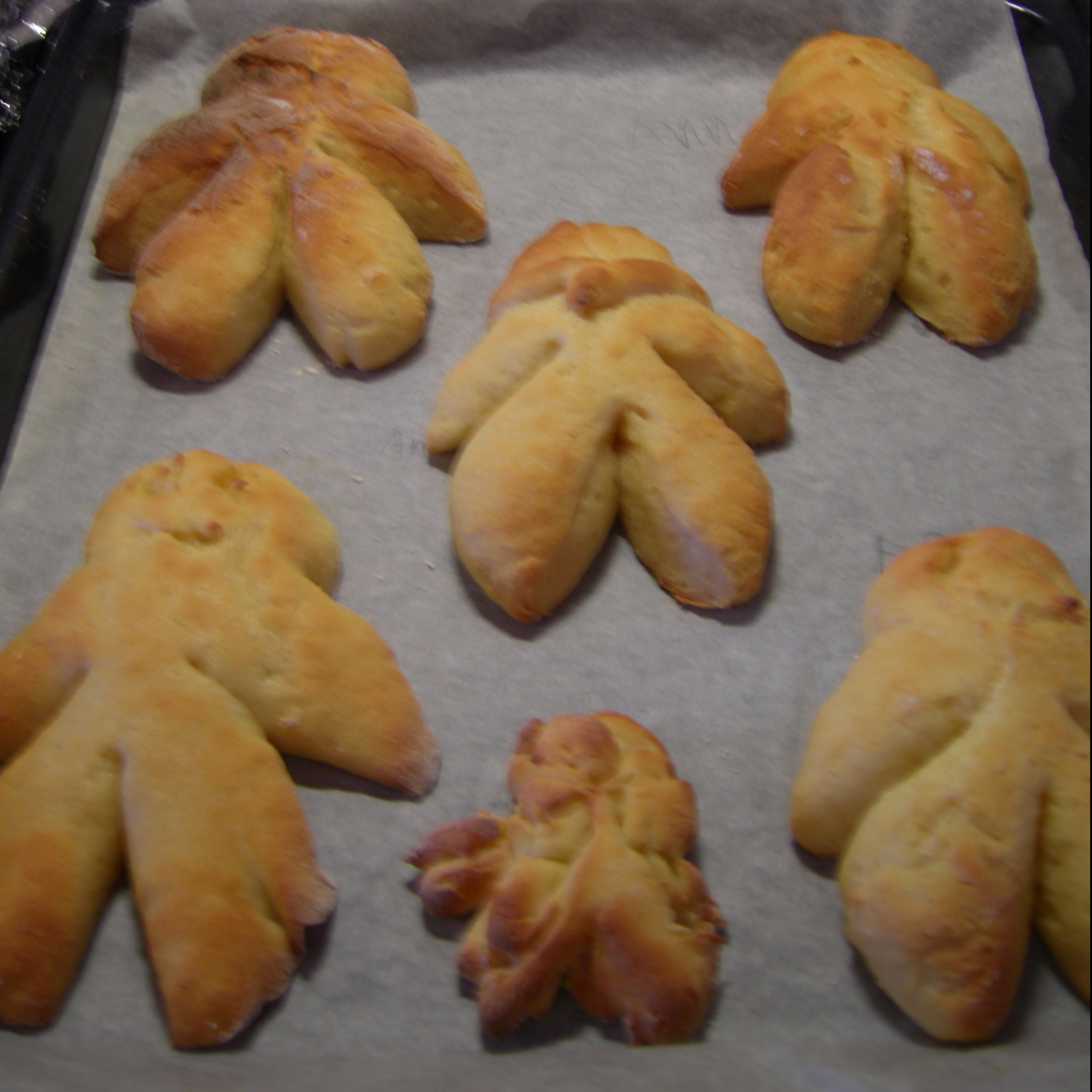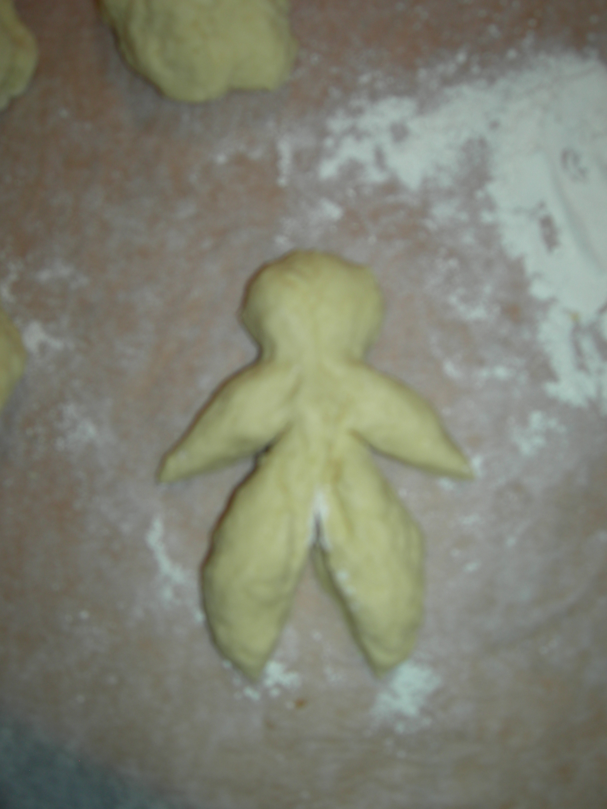 - When the dough has risen, flour your hands a little and take small portions of it which you can shape into little men. I made a kind of oval ball, then shaped the head and then made two cuts for the arms and a central cut for the legs. I then shaped the arms and legs a little.